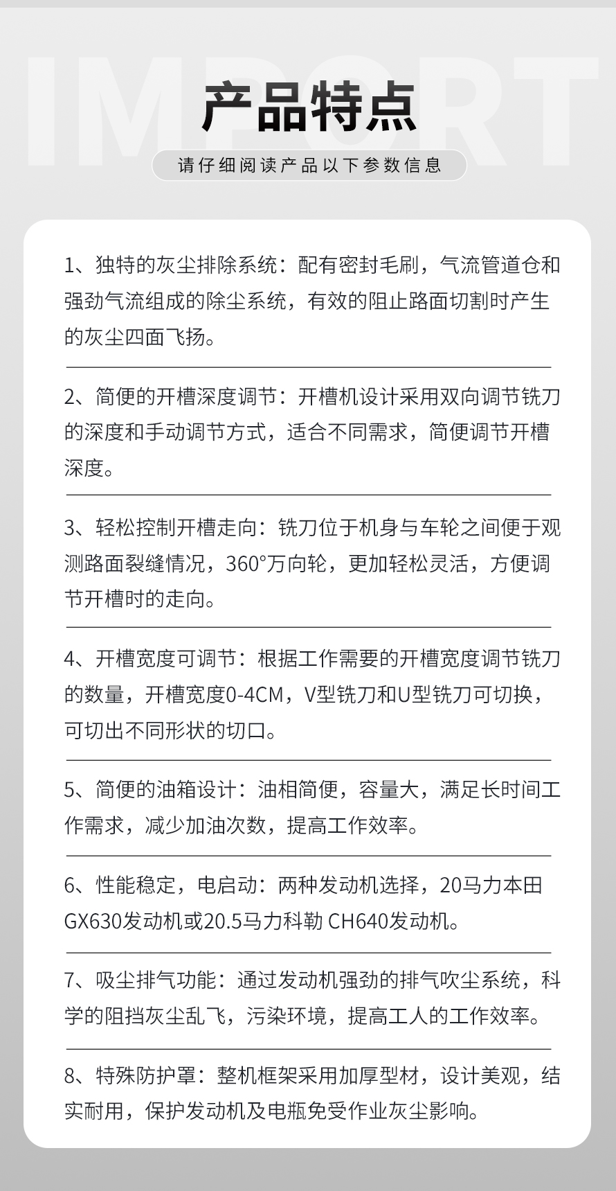 適用于瀝青路面灌縫修補(bǔ)前的裂縫打?qū)?。該設(shè)備具有使用方便,擴(kuò)縫速度快,刀片使用壽命長,擴(kuò)縫寬度可調(diào)等優(yōu)點(diǎn)